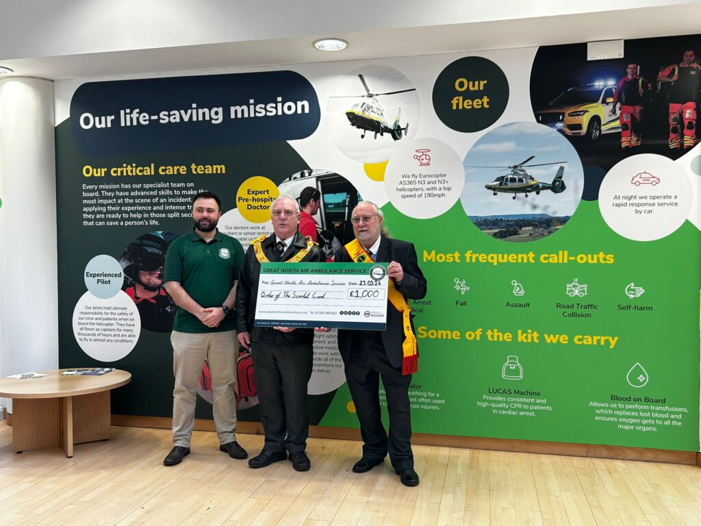 A heartfelt thank you to the Durham Freemasons and the Head of the Order of Scarlett Cord of Durham and Northumberland for donating £1,000 to our Operation SOS campaign.